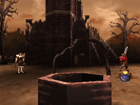 When the player chooses the "Attack" option from the command menu and picks a target, the character will charge in and perform an initial strike at the enemy. While doing so, two blue squares will pop up, one fixed in the center and the other on the outside edges of the screen, zooming into the central square. When the outside square aligns with the center square, the player should press the X button. If timed correctly the combined square will flash white and the addition will continue and the process will be repeated. If the player misses the timing, the center of the square will either turn Blue if the player is too slow or Gray if the player is too fast.
